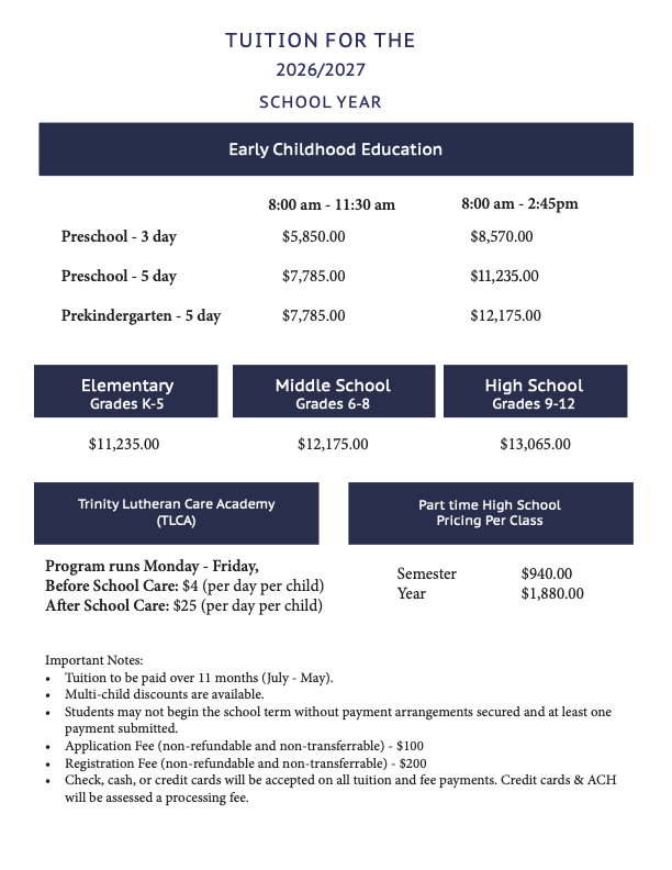 Open Enrollment for Trinity Lutheran School happens in late January. We encourage you to set up a tour as soon as possible. After your tour, an application link will be sent to you. You will want to submit this application as soon as possible in order to be considered for enrollment.